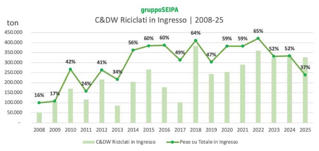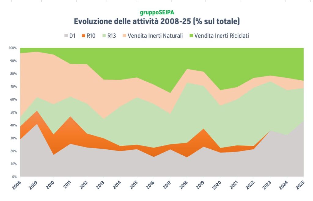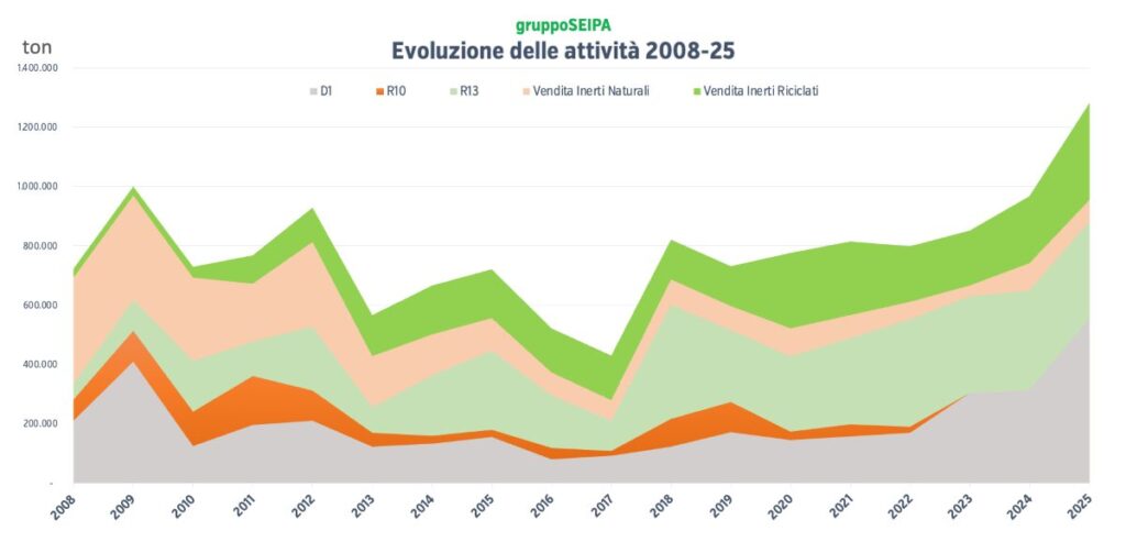 Dal 2008 al 2025 la produzione di aggregati inerti riciclati nell’ambito Gruppo Seipa cresce di 10 volte. Il 75% dei materiali in uscita è oggi di natura riciclata.
