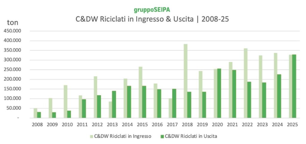 Nel 2025 la produzione di aggregati riciclati da rifiuti da costruzione e demolizione (C&DW) ha superato le 320 mila tonnellate, segnando un livello di scala industriale significativamente superiore rispetto alle prime sperimentazioni del percorso circolare avviato nel 2008.
