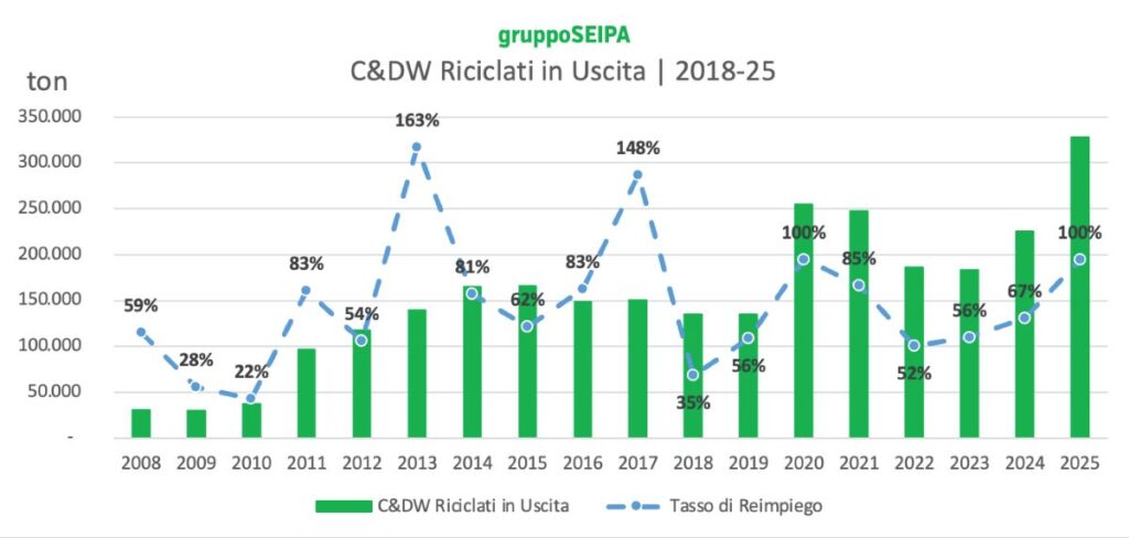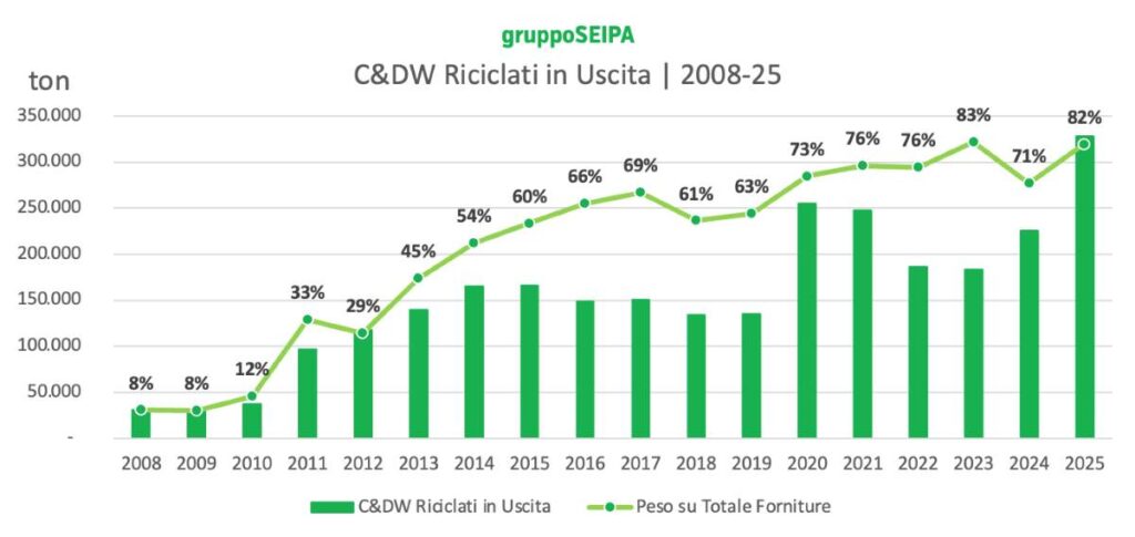 Nel periodo 2020–2025 il Gruppo Seipa ha mantenuto un tasso medio di reimpiego del 77%, mentre il 75% dei materiali in uscita dagli impianti è di natura riciclata, segno di una crescente integrazione dei processi circolari nella filiera produttiva.