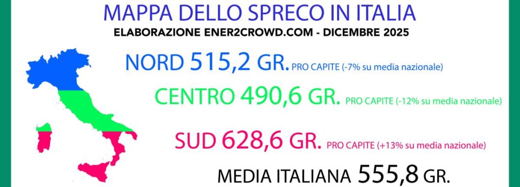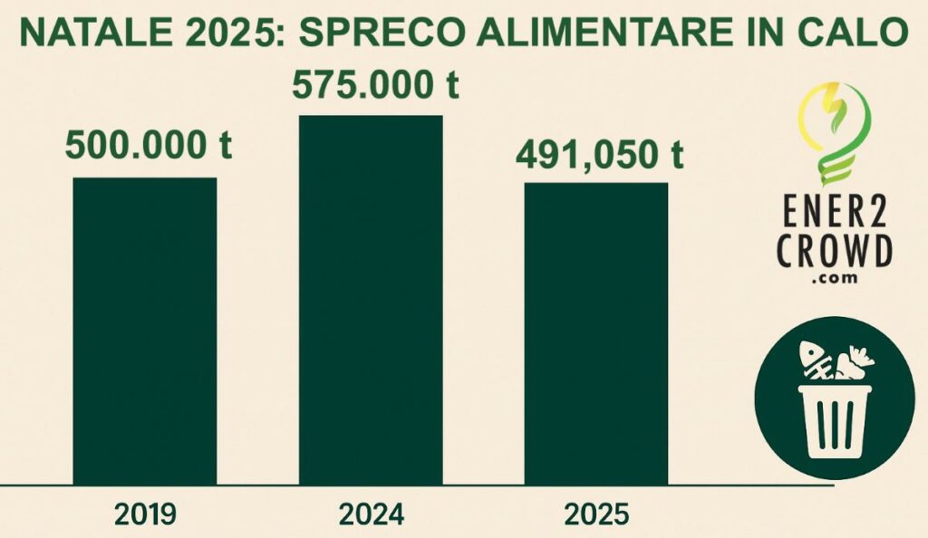 Tenendo conto che lo spreco natalizio ha mostrato negli ultimi 10 anni una forte correlazione (0,78) con lo spreco settimanale medio nazionale, gli analisti di Ener2Crowd hanno applicato un valore ponderato di questo miglioramento all’intero periodo delle festività, arrivando ad una previsione di 491.050 tonnellate di cibo buttato tra il 24 dicembre 2025 e il 6 gennaio 2026 (-14,6% rispetto alle 575.000 tonnellate dell’analogo periodo dell’anno precedente).