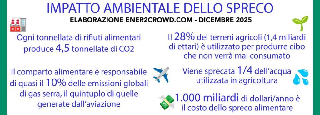«Ogni tonnellata di rifiuti alimentari produce circa 4,5 tonnellate di CO2» sottolineano gli analisti di Ener2CrowdUno studio pubblicato su Nature Food stima in addirittura 9,3 miliardi di tonnellate di CO2 equivalente le emissioni globali da spreco di cibo, pari ad un terzo delle emissioni dell’intero sistema alimentare mondiale.