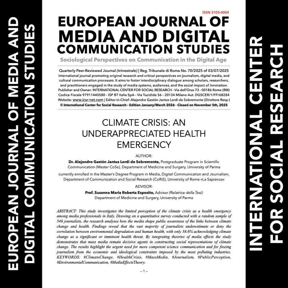 In questo primo numero indicizzato viene presentato lo studio del dottor Alejandro Gastón Jantus Lordi de Sobremonte dedicato alla percezione limitata della crisi climatica come emergenza sanitaria tra i professionisti dei media in Italia.