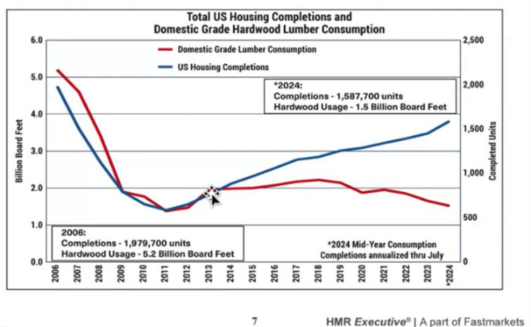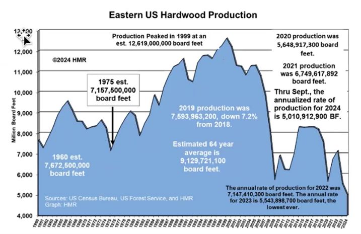 L’industria del legno di latifoglia americano sta affrontando un periodo di incertezze, con un calo significativo della produzione sia di legno di qualità che industriale, scesa da 16.88 milioni di metri cubi nel 2022 a meno di 12 milioni nel 2024, minimo storico. A fronte di una domanda interna in diminuzione per il legno di qualità e di un panorama produttivo in calo, l’attenzione verso i mercati esteri e la gestione sostenibile delle foreste diventano temi sempre più cruciali.